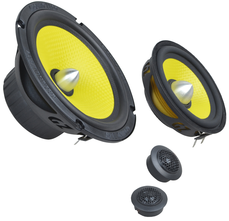В серии TITANIUM представлены коаксиальные и компонентные акустические системы с диффузором 3D-HQPP желтого цвета.