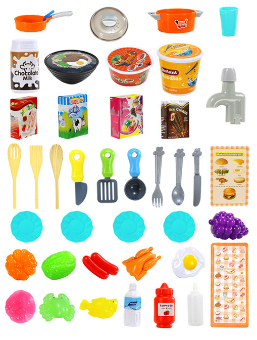 В комплект входит полноценный набор кухонных аксессуаров - 42 штуки! Есть кастрюля и сковородка для приготовления пищи, несколько баночек и бутылочек для соуса, кетчупа и молока, тарелочки и столовые приборы. А ещё имеются упаковки с разнообразными продуктами, из которых юный повар сможет приготовить множество блюд. Главное - ничего не надо докупать!